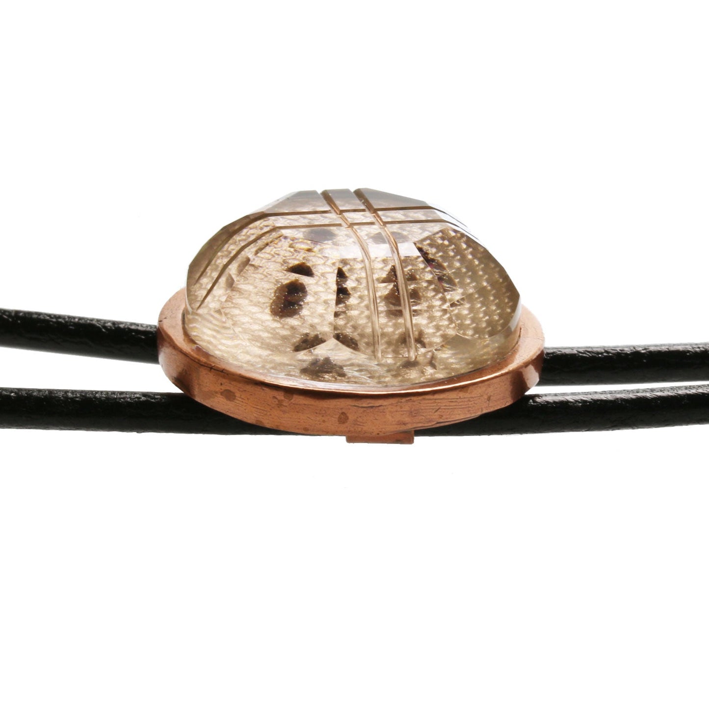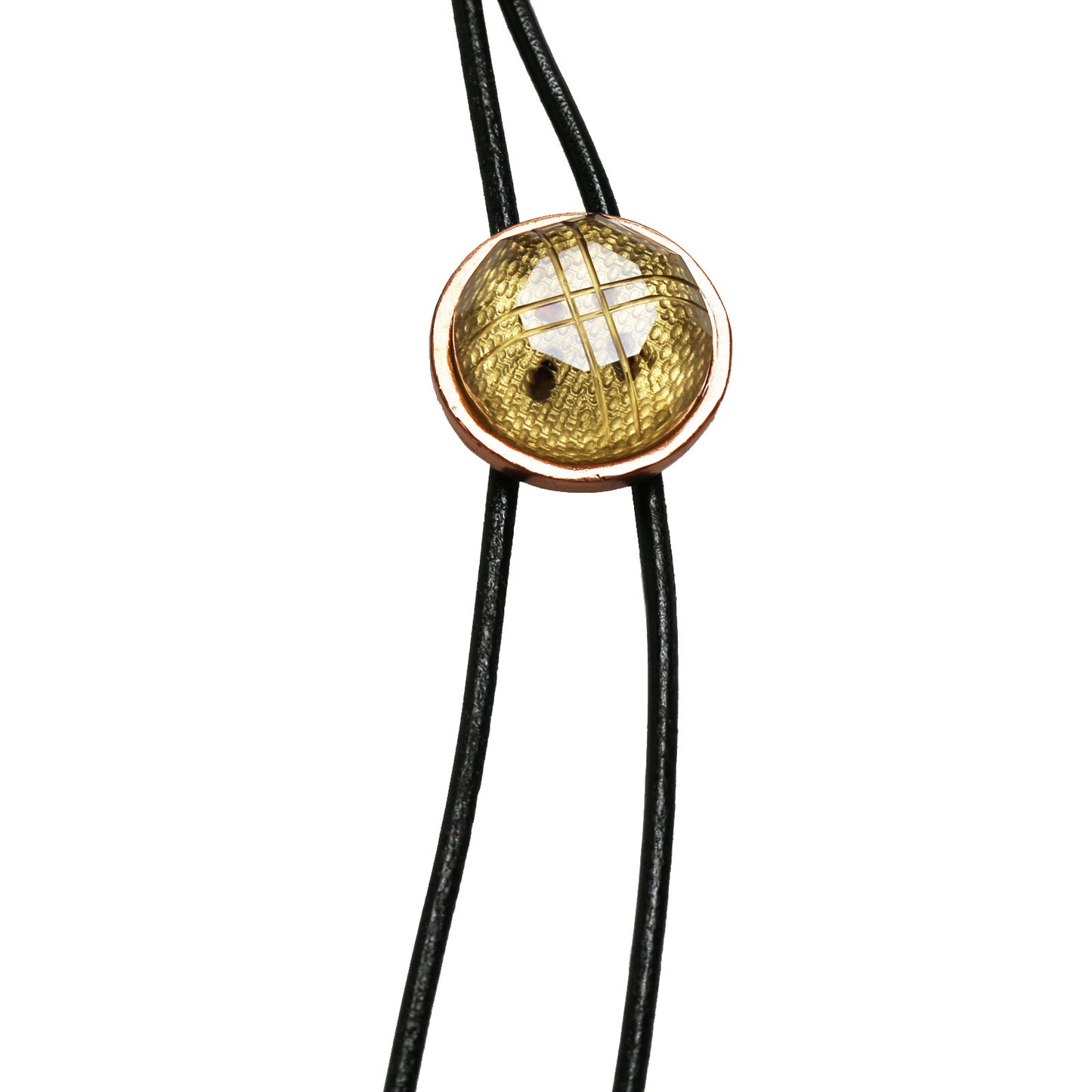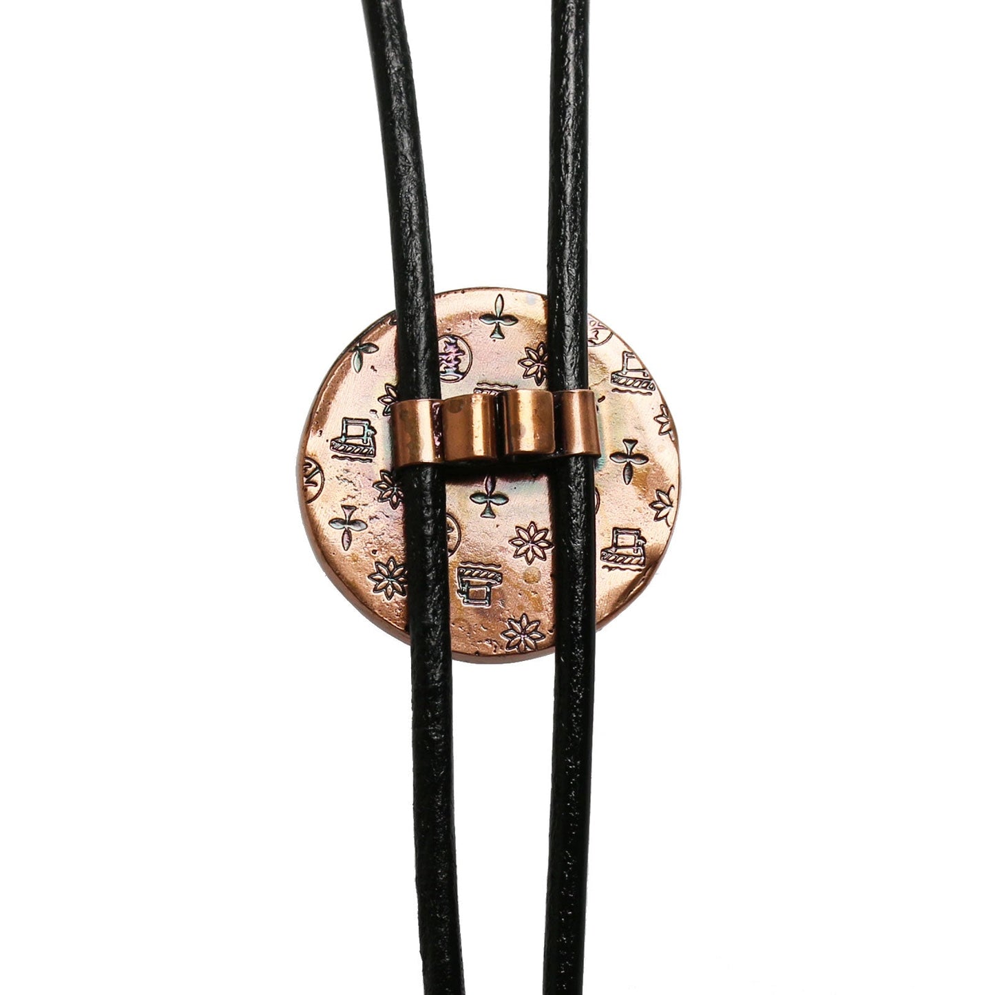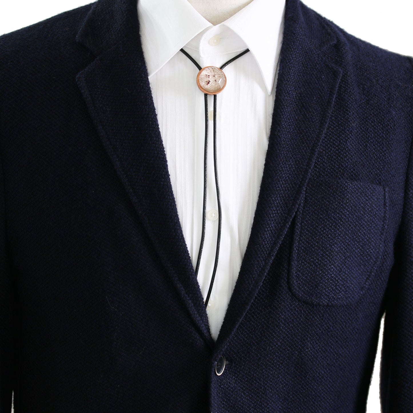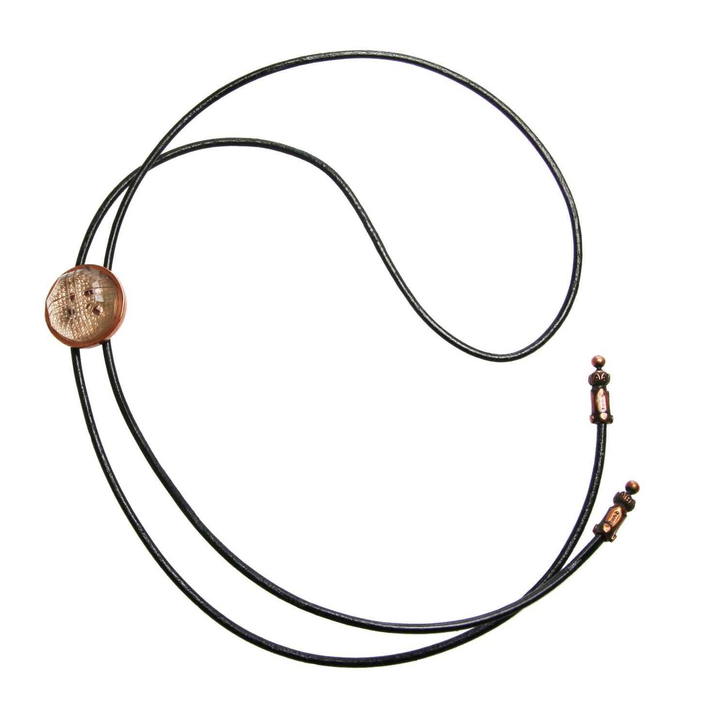 It is a leather strap bolo tie using round plastic parts of "Dandy Series". It is easy to coordinate with chic pink. It is recommended for accents according to the dark shirt. Coordinating casually according to light shirt is also wonderful. Four holes were opened with perforation from behind on uneven color paper, after hardening with resin, painted Bordeaux color from the back. The contrast with the color seen from the four holes is the point.