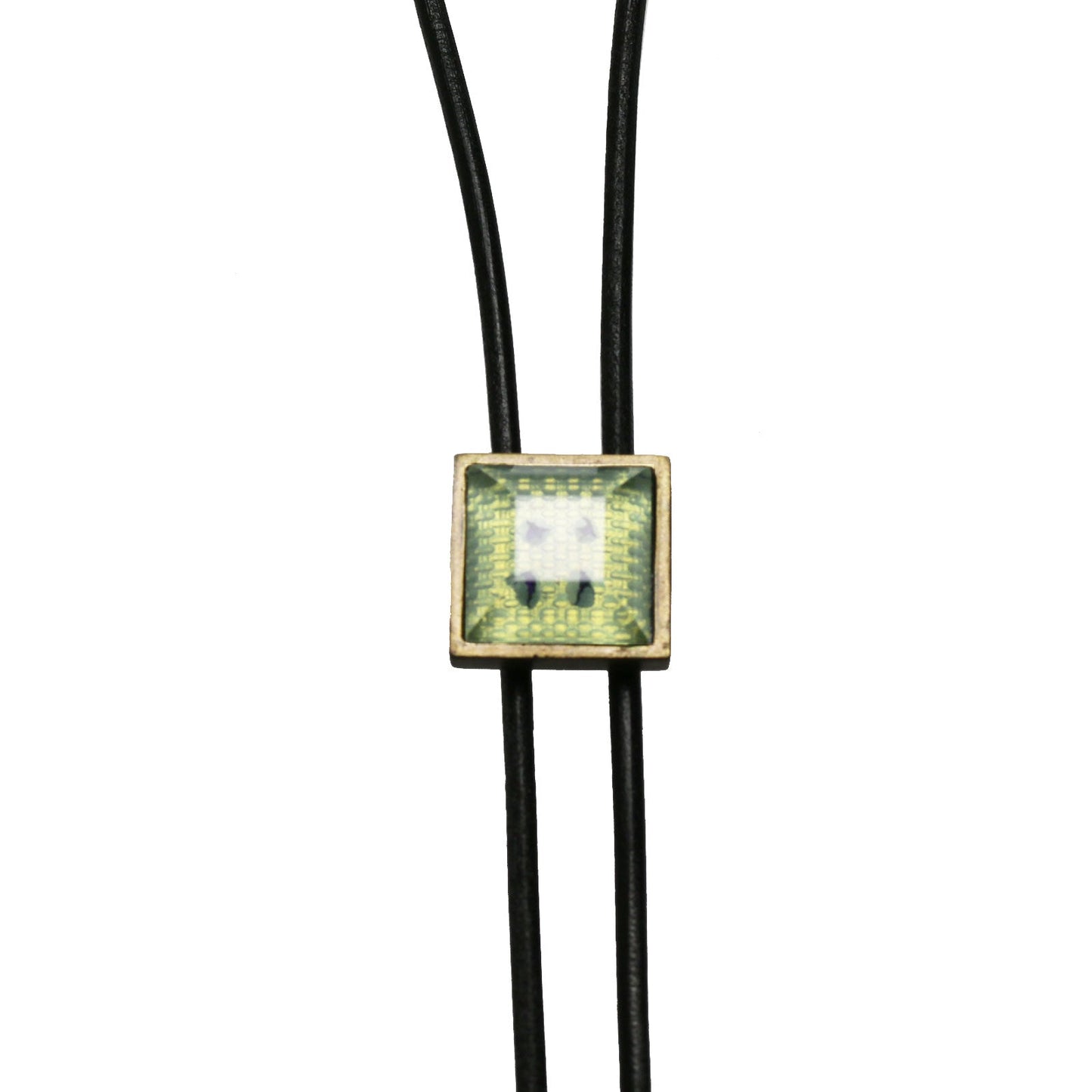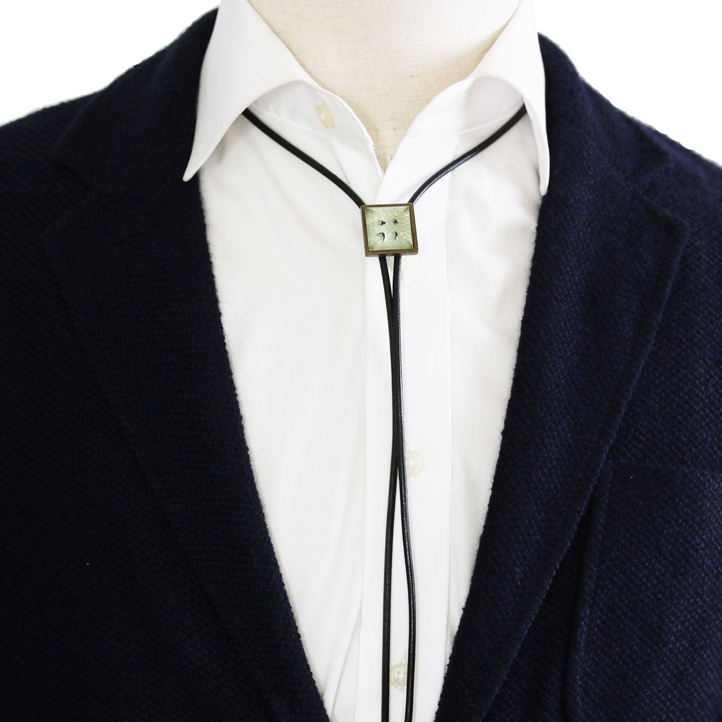 It is a leather strap bolo tie using gold blue of resin parts of the "Dandy Series". It is a distinctive shade that looks both gray and gold depending on the angle. Pleasing to casual attire accents. The color stands out if you match the shade of astringent. Four holes were made by perforating from the back on color paper with irregularities, after solidifying with resin, painted purple paint from behind. The contrast with the color seen from the four holes is the point.