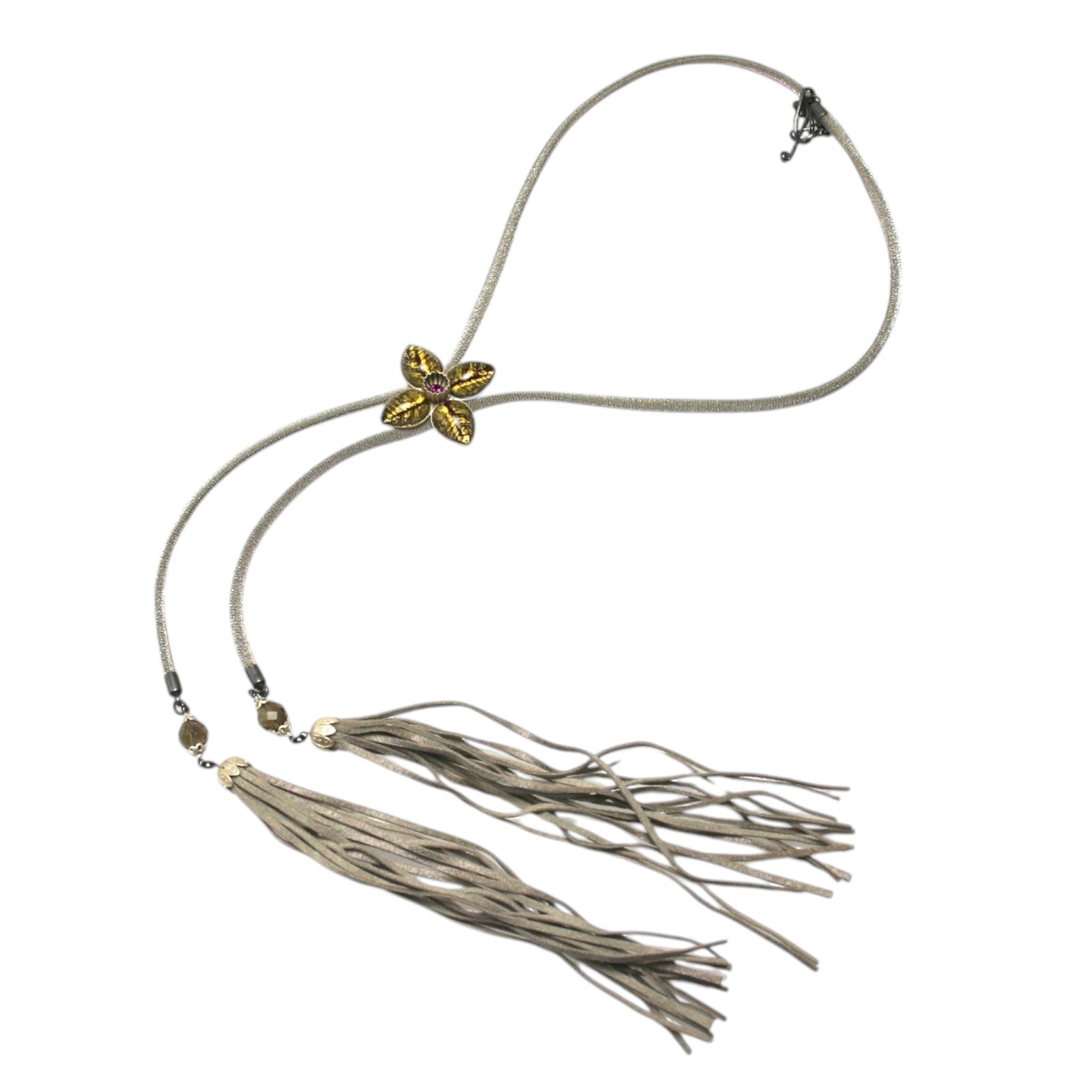 It is a long necklace using the resin parts from the "Forest Series" (Purple). Elastic gray ribbon adds a mature look. The long fringe is an accent. You can enjoy a wonderful fashionable look when you match it with simple clothes. It is also lightweight for its volume, making it easy to wear. This jewelry is also recommended as a gift.