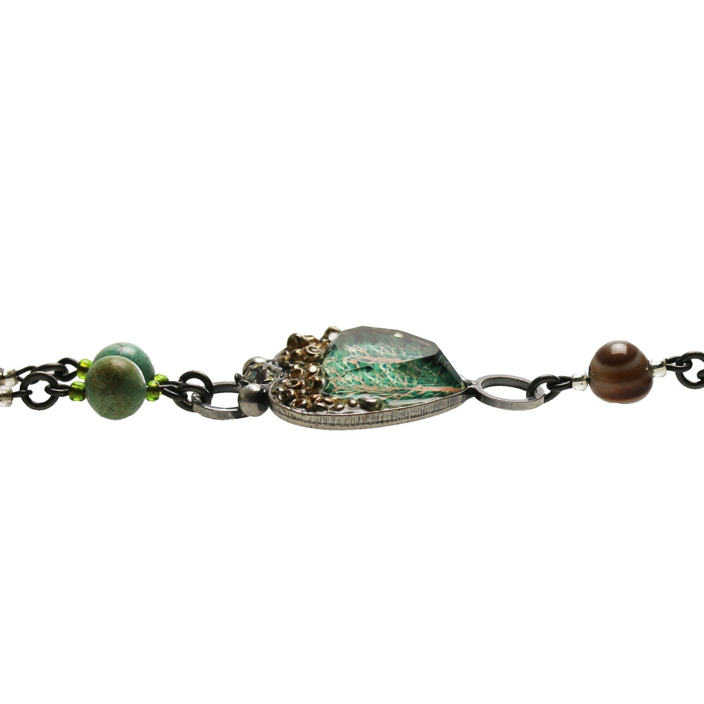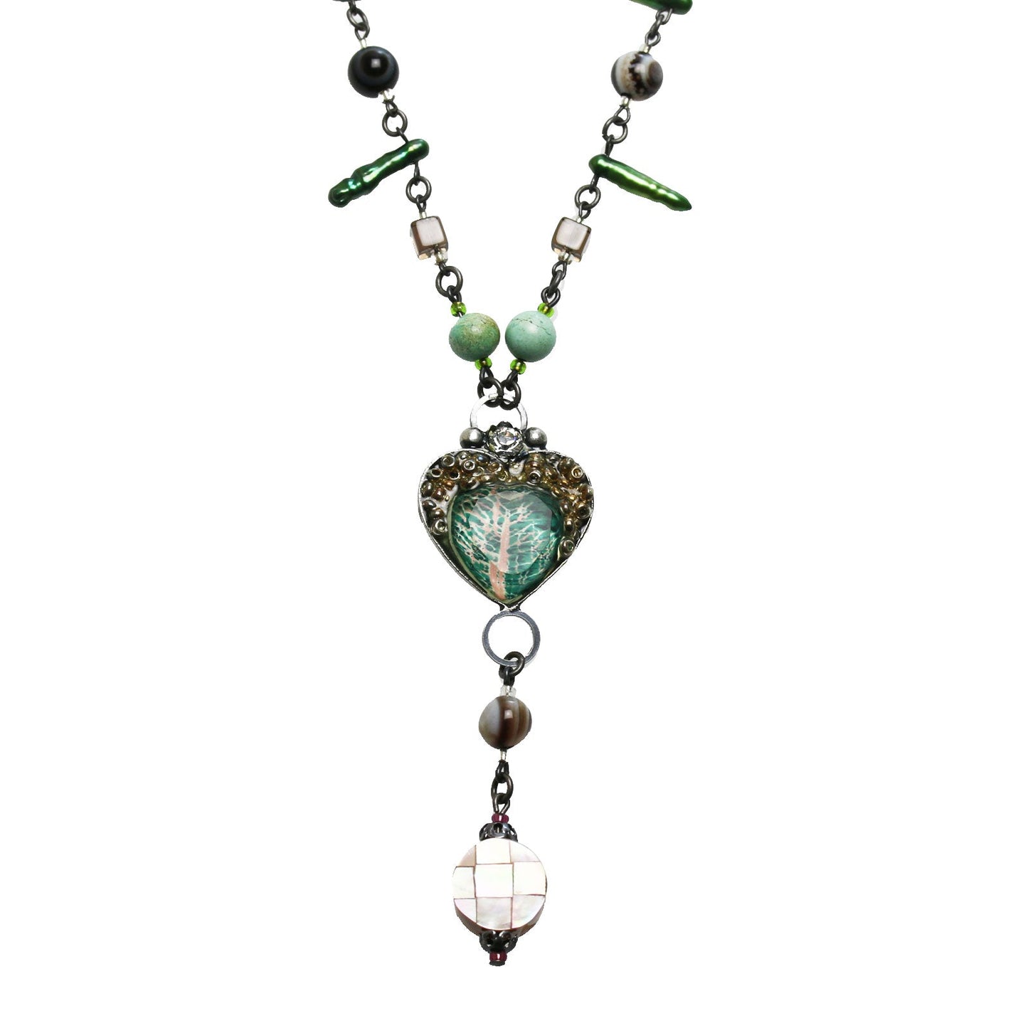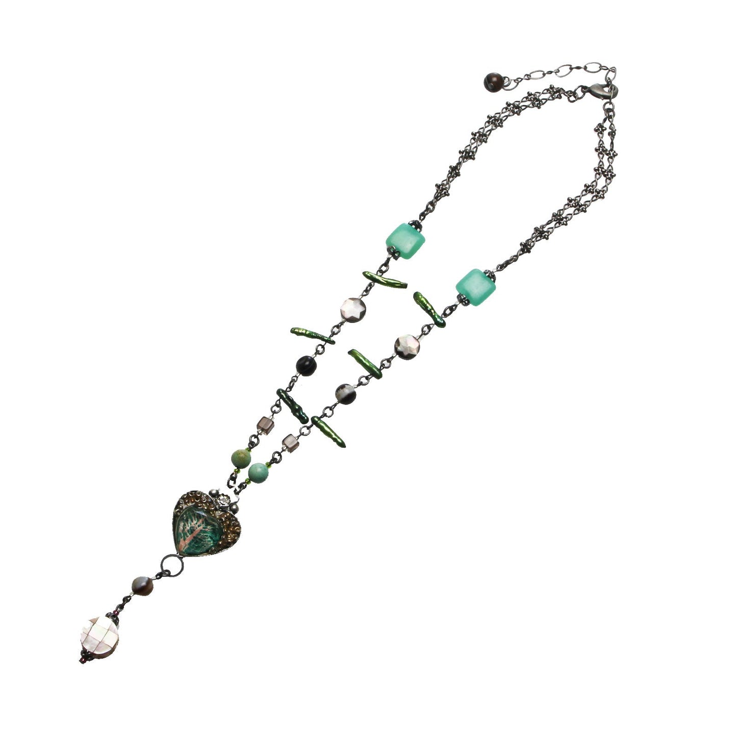 It is a necklace using resin parts of "Forest Series" (Green). It attracts the eyes with unique shades. freshwater pearl, shell, Tibetan agate, and aragonite were combined according to the color of the resin. Recommended for casual accent of the chest.