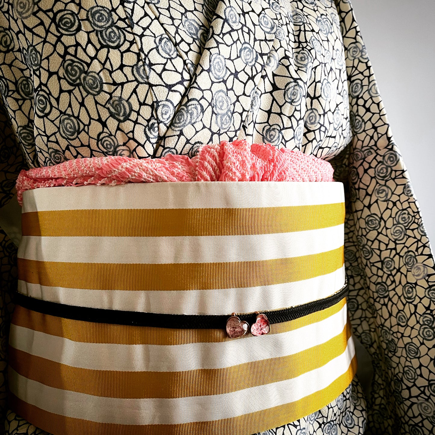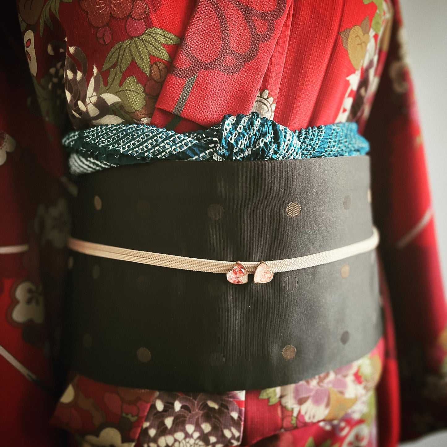 It is a Obidome using heart type resin parts of "Plum Cake Series" (Pink) and "Lily Series" (Red). You can combine two hearts in any position you like. You can also simply wear one piece. You can also use it as a choker through a ribbon or string. *Japanese Kimono accessories "Obidome" refers to an accessory passed through 'Obijime'(a string tied around the waist to fix obi).