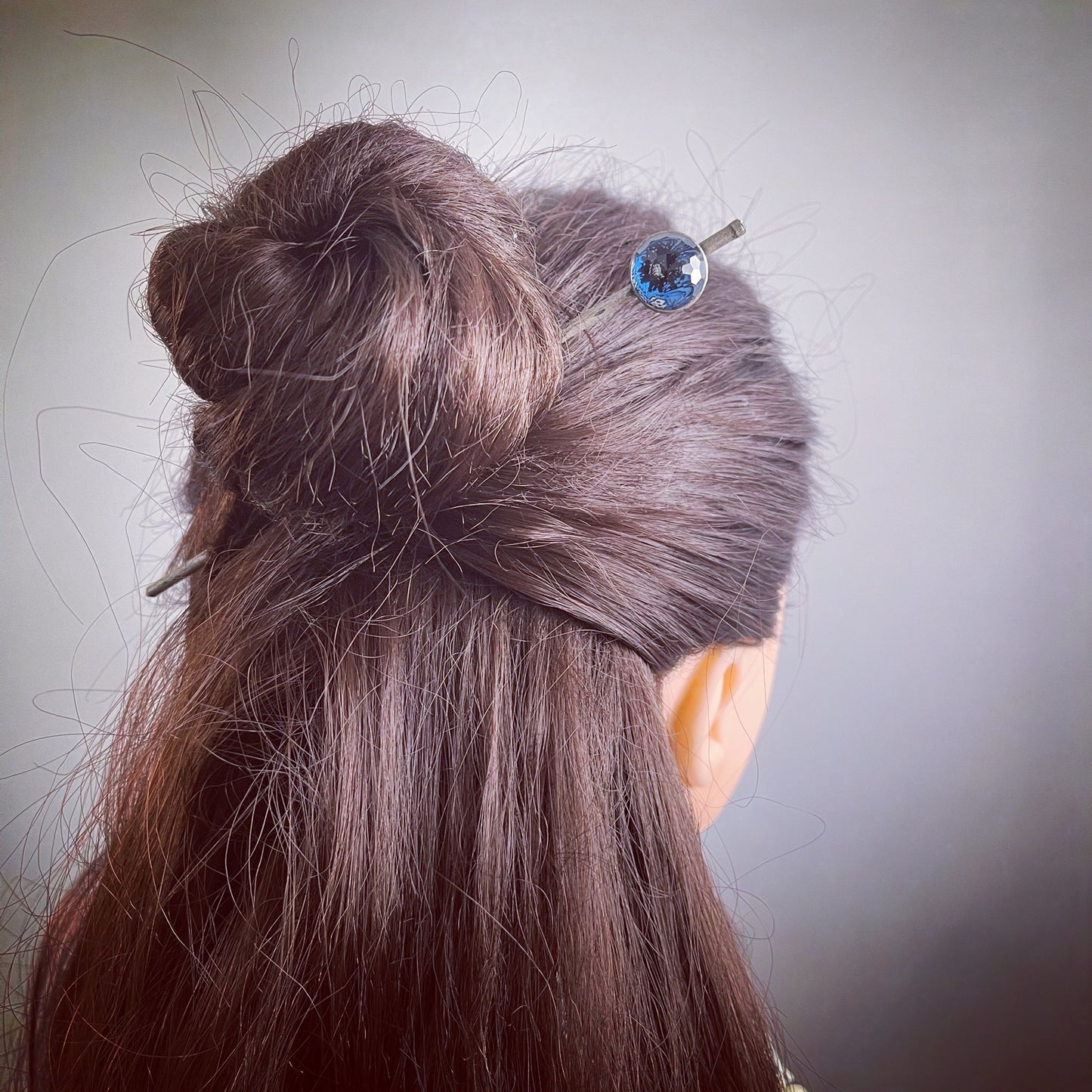 It is an ornamental hairpin using the resin parts of the "Marble Series" (Blue) round shape. It is the length that is easy to use to make a dumpling. It is recommended for those who are looking for a simple dumpling hair accent.