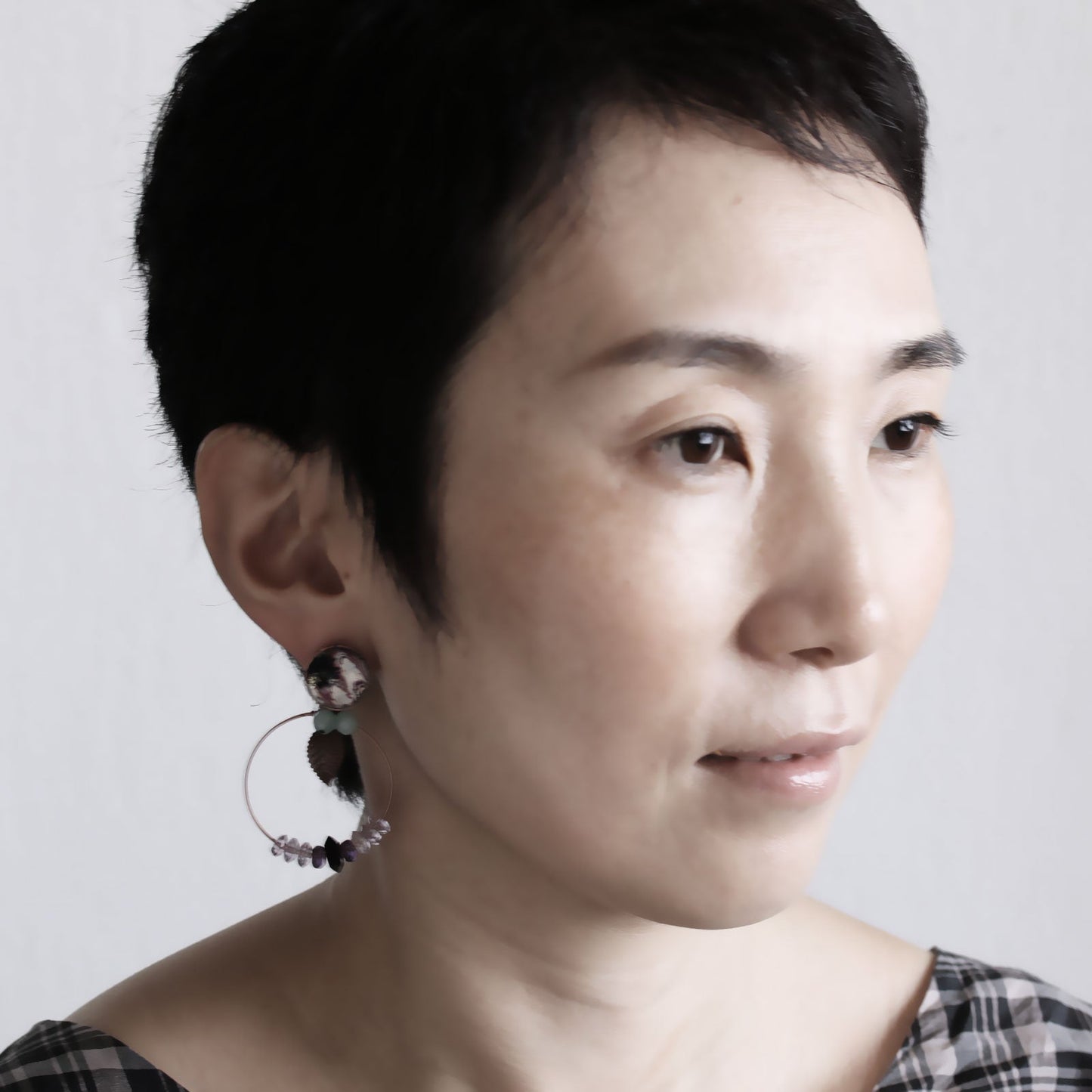 It is a pair of pierced earrings using round resin parts of "Marble Series" (Purple). It attracts the eyes with unique shades. Amazonite, amethyst and onyx were combined according to the color of the resin. Hanging ornaments are attached to the catch part so you can simply wear it with a catch with nothing attached. You can enjoy the gorgeous fashion of your ear.
