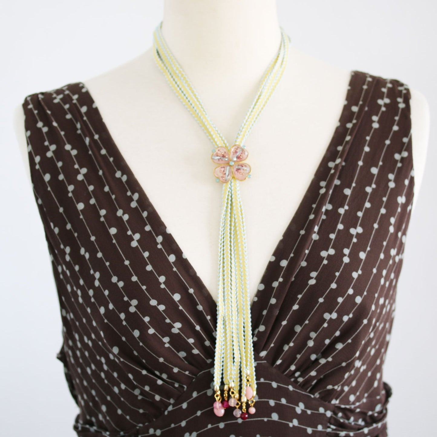 It is a ribbon bolo tie necklace using the resin parts of the "Jewel Box Series" (Pink). It was a combination of ribbon, aragonite, rose quartz and agate. The gorgeous colors is recommended to accent the simple outfit. It is used the ribbon, so worn easily and the lightweight.