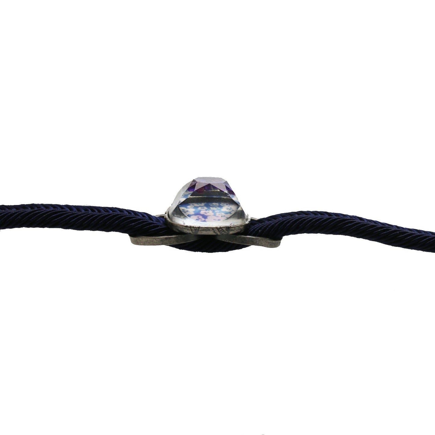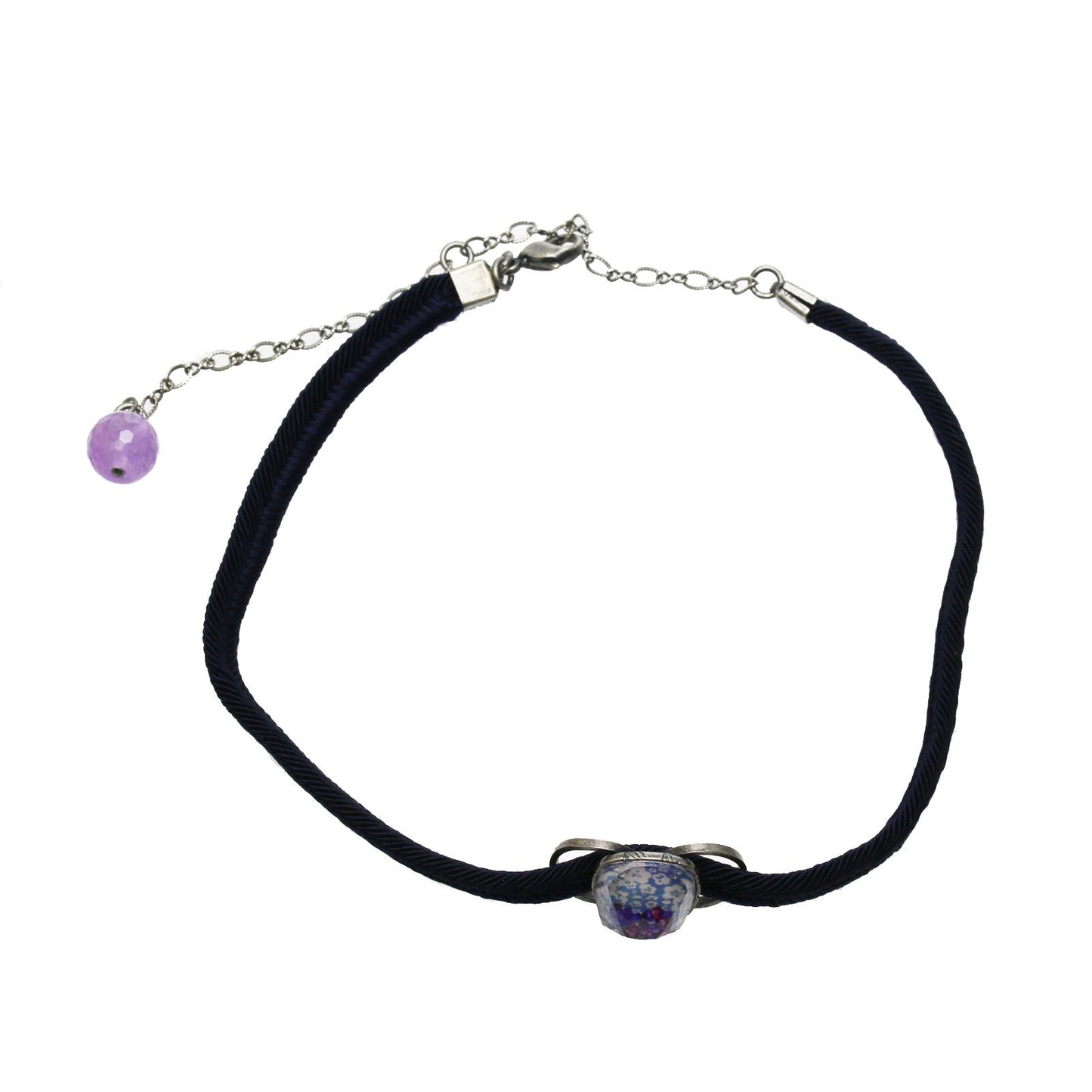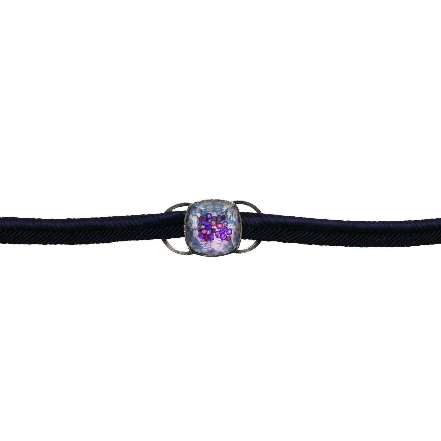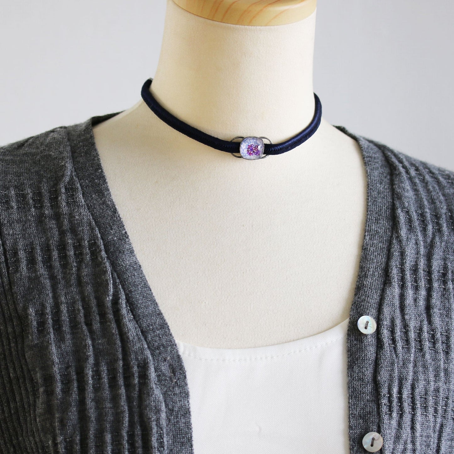 It is a ribbon choker using resin parts of "Plum Cake Series" (Purple). It is easy to coordinate as it is a simple design with only a square resin part attached to a dark blue blade ribbon. We hung an amethyst in the adjuster. Recommended for the unique accent of the neck.