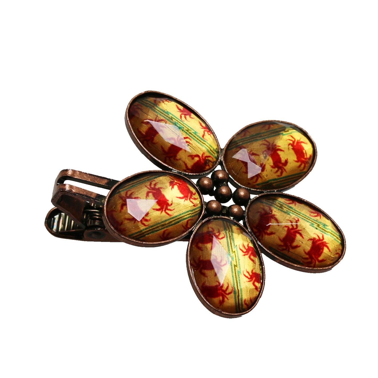 It is a flower scarf clip using the resin part from the "Crab Series." The antique atmosphere matches the crab pattern. Because it doesn't require a needle, it is easy to fasten for scarves or shawls. It is also recommended for the elderly who have difficulty moving their hands. Since it is a large ornament, how about coordinating with your tie for parties and other occasions? It is designed for both men and women.