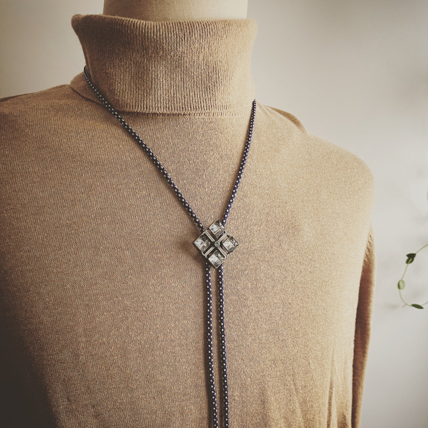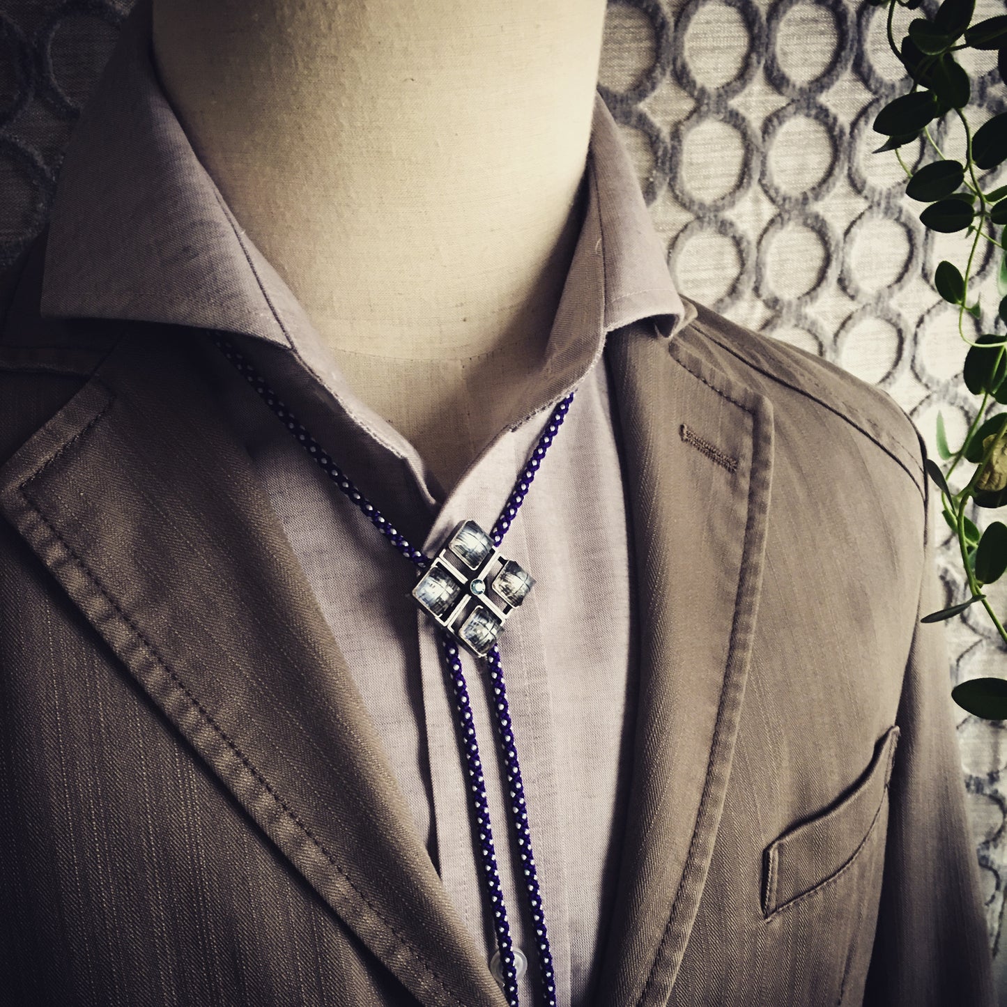It is a silk braid bolo tie from the "Musical Note Series" (Blue) square shape made of resin. The cool blue color is eye-catching. We especially ordered the silk string from the craftsmen in Kyoto. You can enjoy wearing it in various ways by sliding the decorative part to your desired position. This product is made intentionally so that silver or gold powder is put in the resin as a design and the musical note is not seen well. Because I cut the part of the note randomly, it may become a slightly different hue from the photograph.
