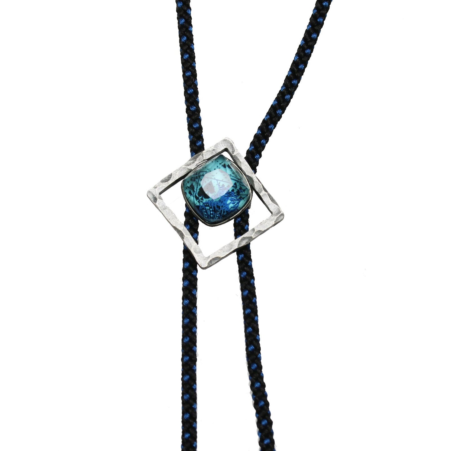 It is a stylish bolo tie using the resin part of the "Mizuhiki Series." The surface cut is beautiful, and the transparency is attractive. Enjoy the color of the Mizuhiki shade at the bottom. The pure silk braided cord is specially ordered from a craftsman in Kyoto. We stuck about the color and how to braid. The decorative part can slide up and down, so you can wear it as a choker or a necklace. The design is suitable for all ages and genders, and also as a gift.