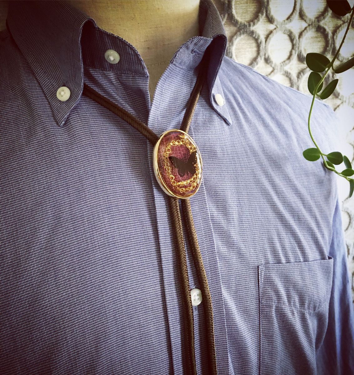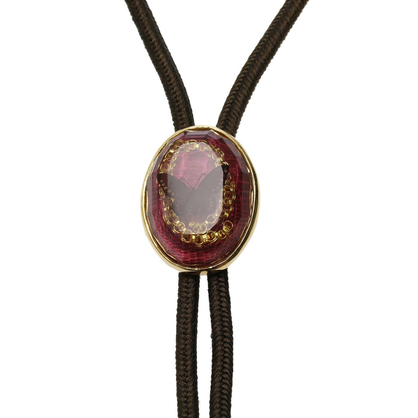 It is a silk braid bolo tie using the resin parts of the butterfly pattern. The rouge color with gold chain shines astringent to pull the eye in a stylish design. It is recommended for both men and women.
