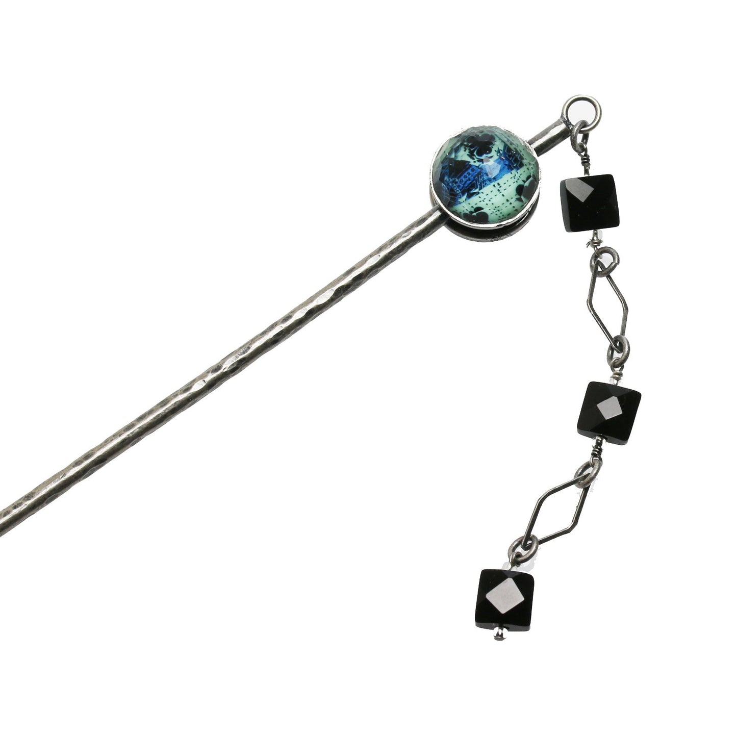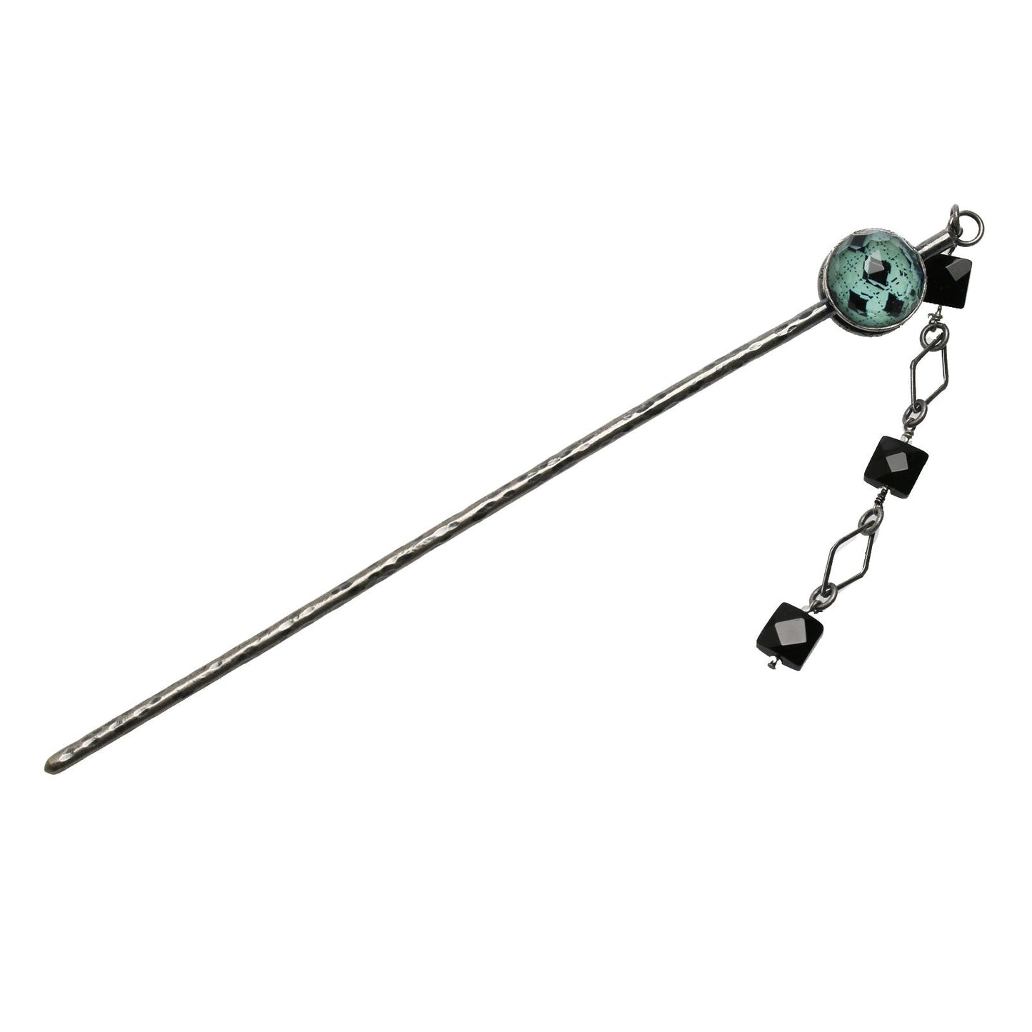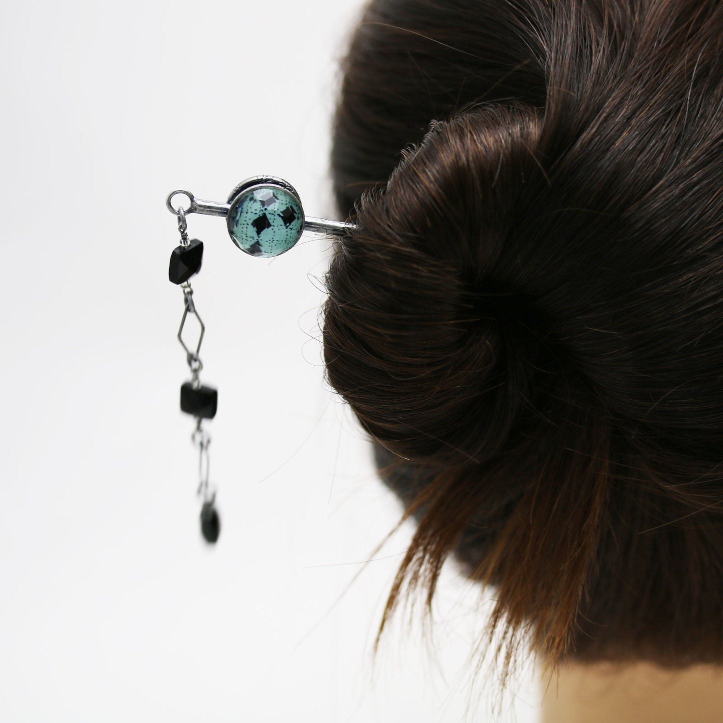 It is the hairpin using the resin parts of the "Play Cards Series". We was hanging onyx to match the hue of the resin. This coordination is easy chic shades.