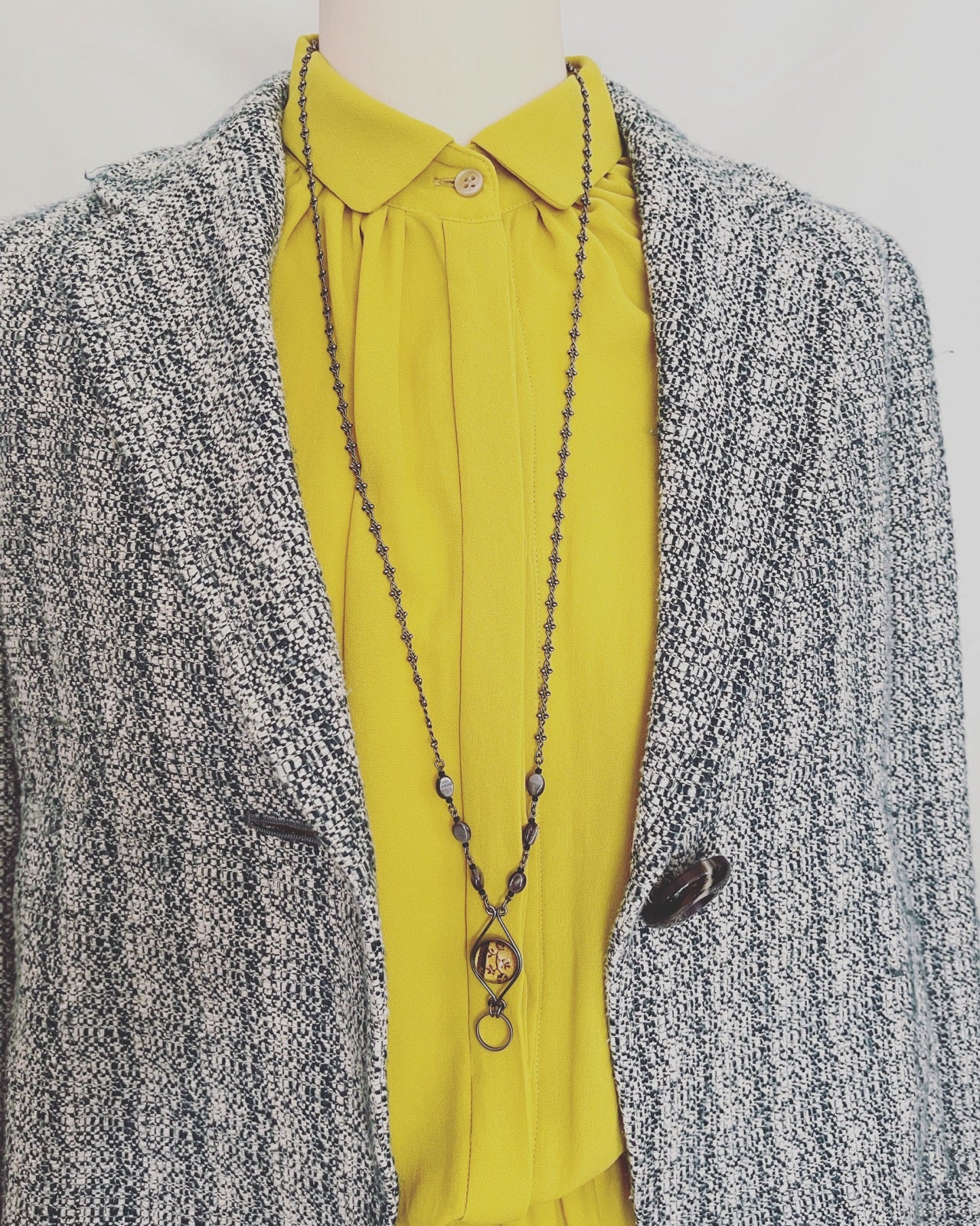 This neck strap uses the round resin part in special edition colors from the "Rose Tree Series." It has a clasp, so when you remove it, it becomes a necklace. It has the feel of a long necklace, so you can enjoy casual fashion. The glossy gray shell is an accent. It is a fashion accessory that is also recommended as a gift.